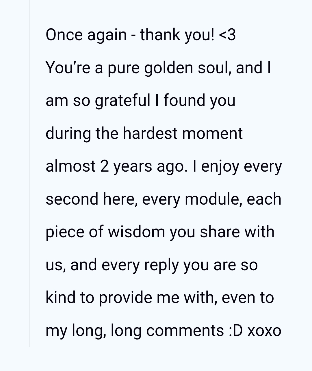 When you join, you get instant access to all modules, allowing you to move at your own pace while being supported by Eva’s ongoing guidance inside the portal.